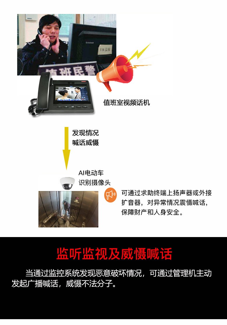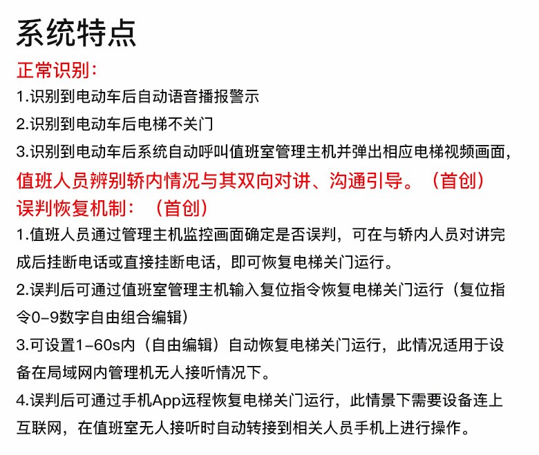 1.識別到電動車后對講控制網(wǎng)關(guān)自動呼叫值班室管理主機(jī)。 2.識別到電動車后自動語音播報警示。 3.識別到電動車后電梯不關(guān)門。三、誤判恢復(fù)機(jī)制:(首創(chuàng))