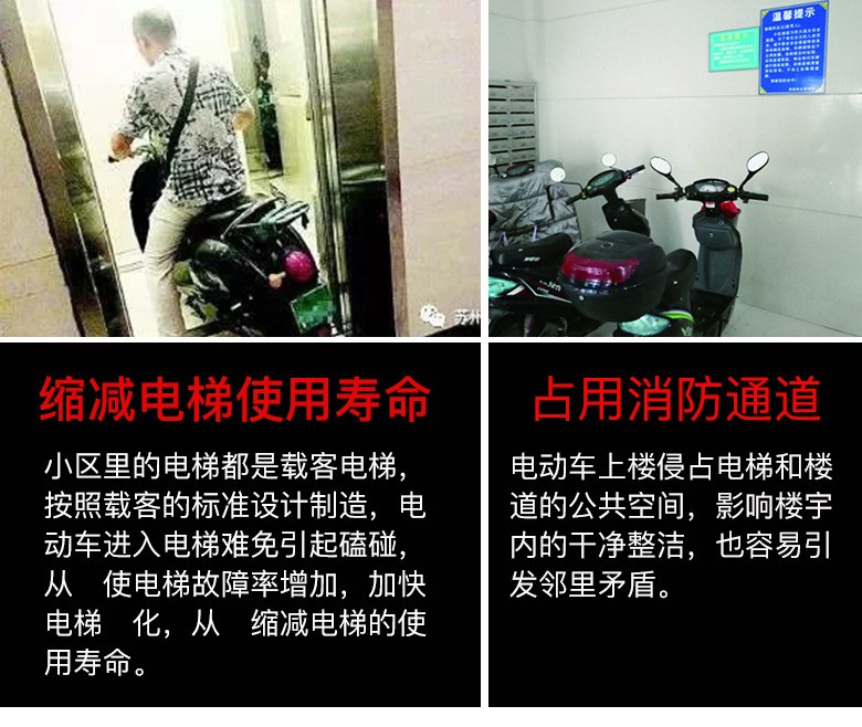 電動車停在樓道里本身就堵塞了消防通道,因電動車電路老化、充電方式不當(dāng)?shù)戎T多原因,還存在起火的風(fēng)險。一旦電動車在狹窄的樓道里起火,高層建筑內(nèi)各種豎向管井易形成“煙囪效應(yīng)”,使火勢迅速蔓延擴(kuò)大,產(chǎn)生的有毒煙氣五分鐘內(nèi)就會蔓延至整個樓道,火焰和濃煙會迅速封堵建筑的安全出口、逃生通道,給逃生增加難度。如果火災(zāi)發(fā)生樓層較高,救援的難度也會進(jìn)一步增加。 受自身體積和重量限制,電動車上樓必須借助電梯。市市場監(jiān)督管理局特種設(shè)備安全監(jiān)察科工作人員表示,小區(qū)里的電梯都是載客電梯,按照載客的標(biāo)準(zhǔn)設(shè)計制造,電動車進(jìn)入電梯難免引起磕碰,從而使電梯故障率增加,加快電梯老化,從而縮減電梯的使用壽命。一旦電梯損壞,最終損害的還是業(yè)主的利益。電動車上樓侵占電梯和樓道的公共空間,影響樓宇內(nèi)的干凈整潔,也容易引發(fā)鄰里矛盾。