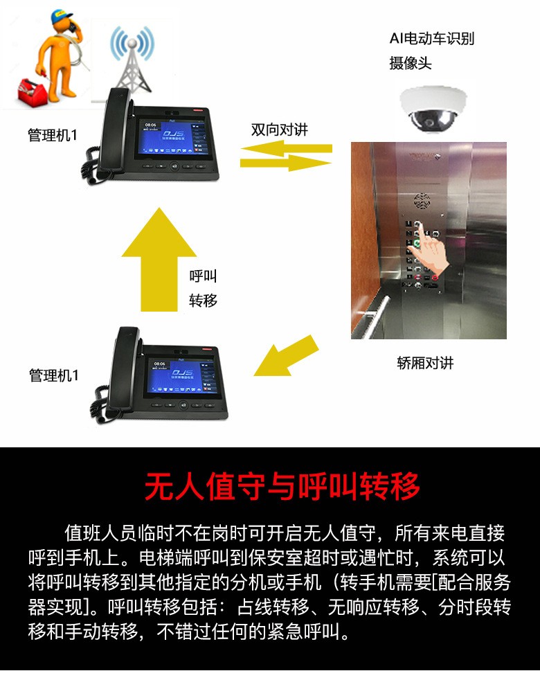 攝像頭識別到電動車后對講控制網(wǎng)關(guān)自動呼叫值班室管理主機(jī)并,聯(lián)動轎內(nèi)AI識別攝像頭在管理主機(jī)上彈出相應(yīng)轎廂視頻畫面,值班人員辨別轎內(nèi)情況與其雙向?qū)χv、溝通引導(dǎo)。(首創(chuàng))