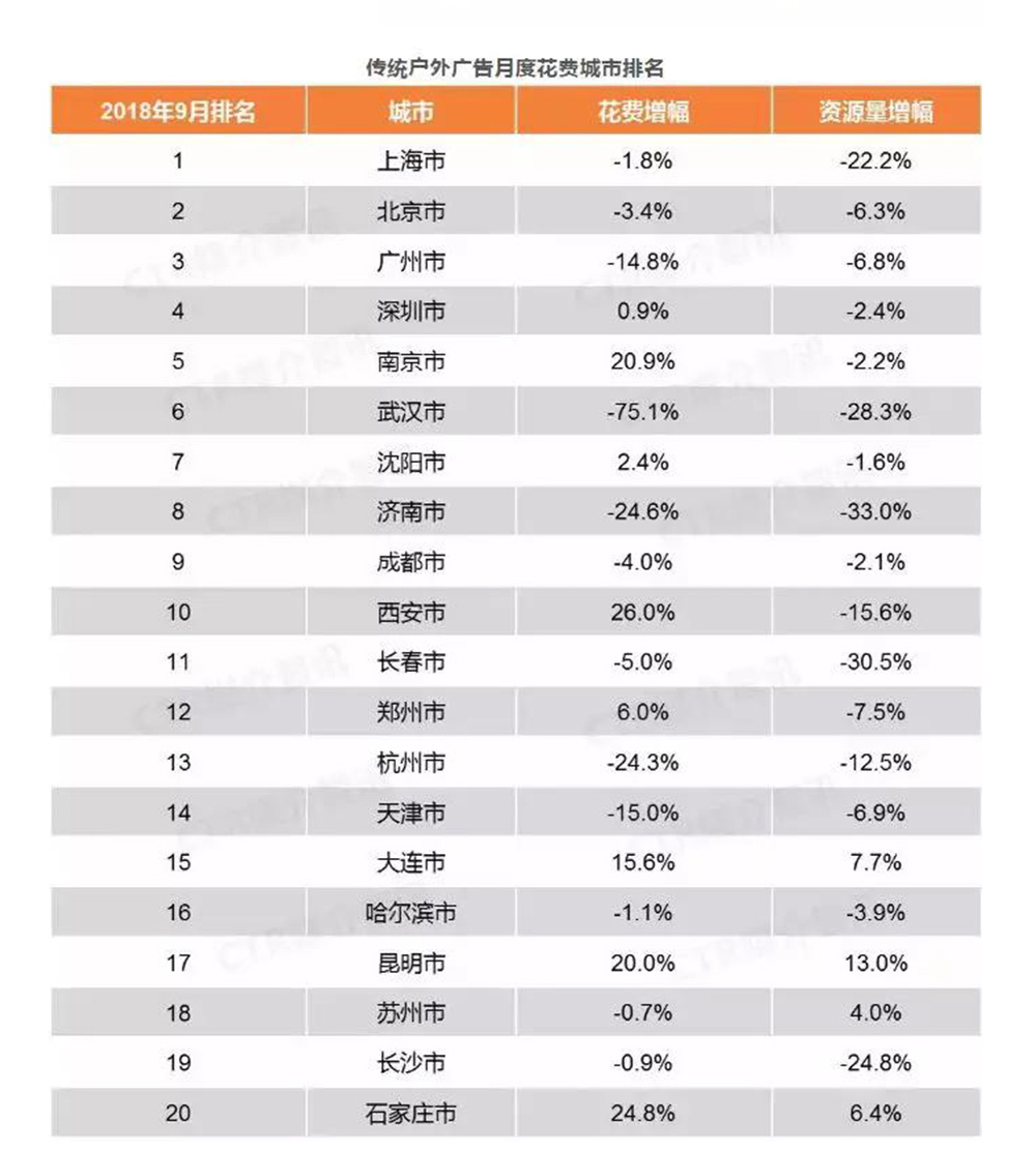 根據(jù)CTR9月發(fā)布的傳統(tǒng)戶外廣告月度花費(fèi)城市的排名,我們可以看到,四大一線城市只有深圳略微有增幅,上海、北京、廣州都出現(xiàn)下降,特別是廣州,降幅達(dá)14.8%;而南京、西安、大連、昆明、石家莊等眾多二線城市延續(xù)了這幾個月以來增長的勢頭,且增幅都超過了15%。