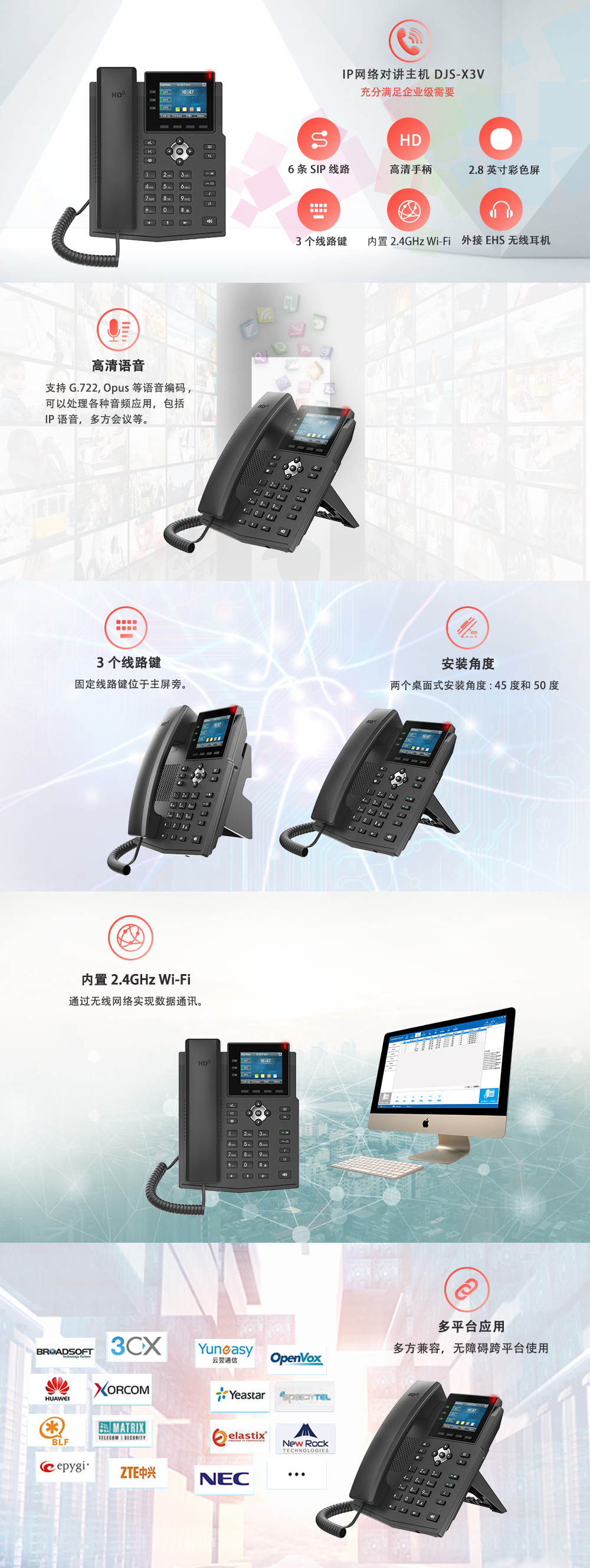 X3V 是一款WiFi話機,具有高清語音,320x240 2.8 英寸彩色主屏, 支持百兆以太網(wǎng),6個SIP賬號,內(nèi)置 2.4G WiFi,支持 PoE供電,三方電話會議等豐富功能;以及可外接 EHS無線耳機等擴展功能;可滿足不同的企業(yè)應(yīng)用場景,并提供優(yōu)質(zhì)的用戶體驗。