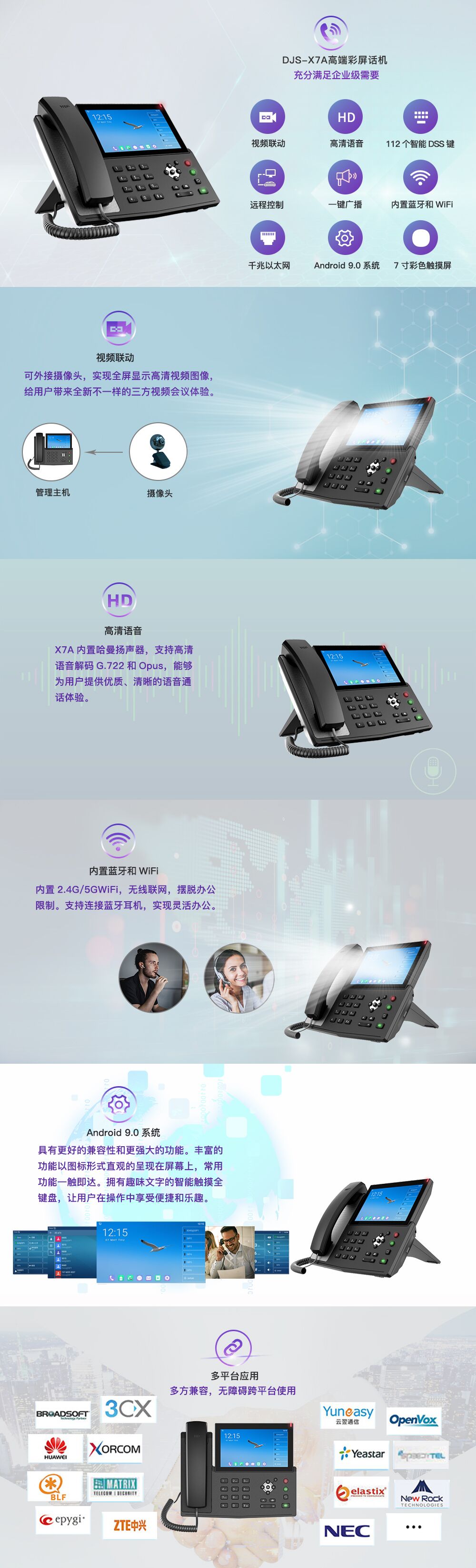 該話(huà)機(jī)是一款集音、視頻和應(yīng)用于一體的高端智能話(huà)機(jī)。基于A(yíng)ndroid 9.0 系統(tǒng),界面使用便捷。采用 7 英寸彩色觸摸屏,內(nèi)置藍(lán)牙 4.2 模塊和 2.4G/5G Wi-Fi 模塊,同時(shí)集成 USB 2.0 接口,為企業(yè)級(jí)用戶(hù)通訊、可擴(kuò)展增值業(yè)務(wù), 提供了豐富靈活的桌面級(jí)通訊產(chǎn)品解決方案。