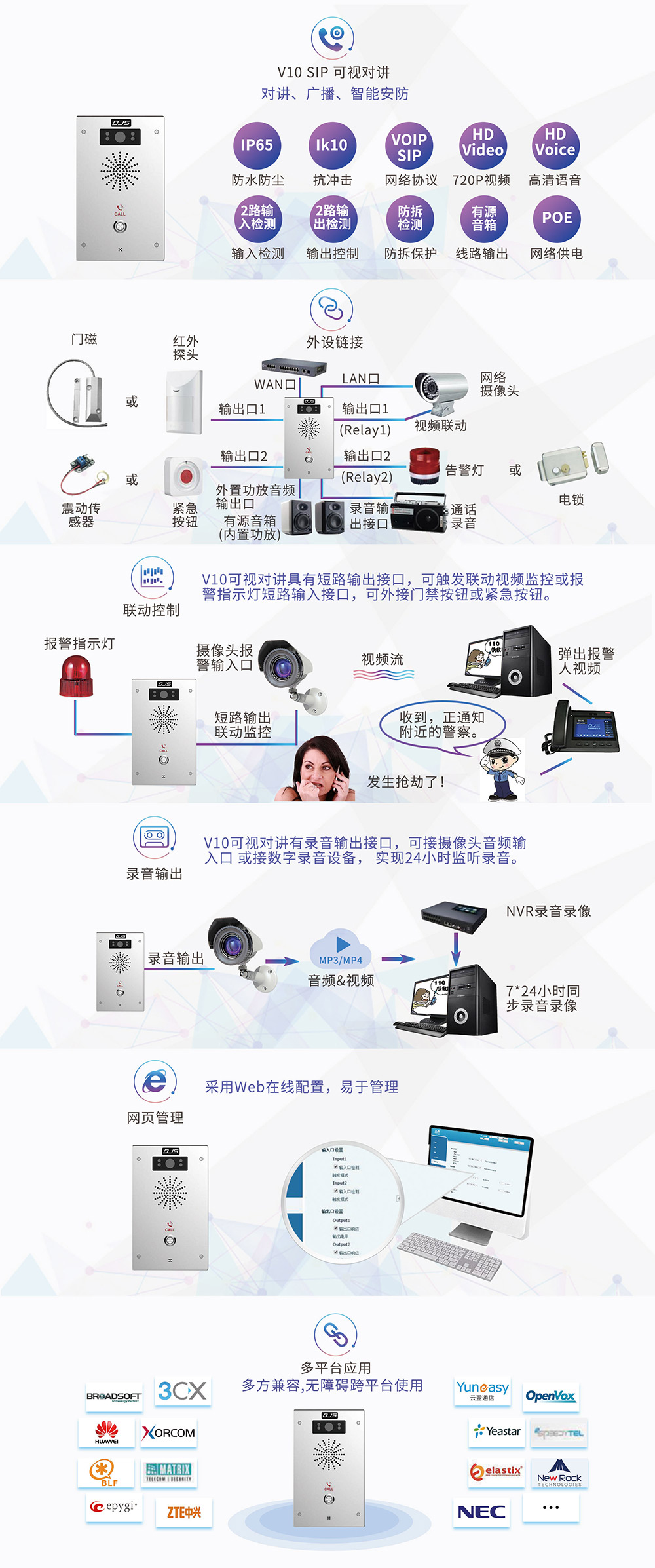 設(shè)計(jì)要求簡(jiǎn)約時(shí)尚,采用鋁合金面板,底殼采用鋁合金。采用工業(yè)級(jí)的芯片,保證了產(chǎn)品的適應(yīng)性好,故障率低。與主流廠商的IPPBX具有很好的兼容性 。內(nèi)置3W揚(yáng)聲器,聲音響亮,可滿足客戶對(duì)高響度的需求;內(nèi)置AGC算法。達(dá)到IP65,滿足室內(nèi)和戶外應(yīng)用對(duì)防水的要求。達(dá)到IPK10,使產(chǎn)品的應(yīng)用場(chǎng)合更廣。滿足各種惡劣工作環(huán)境應(yīng)用的需求。對(duì)講、廣播和智能安防功能三合一。