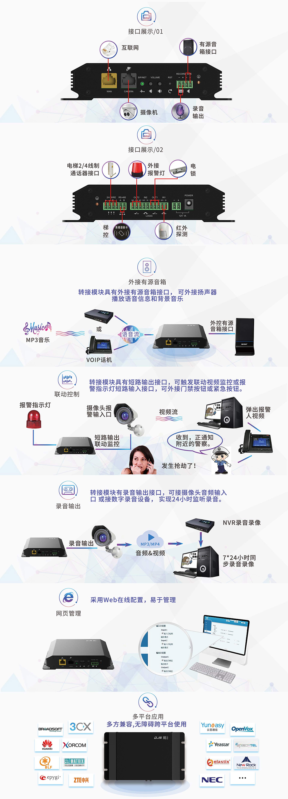 它集多種功能接口于一體:對講、廣播、 視頻、安防、錄音、采播,適應多種使用環(huán)境。